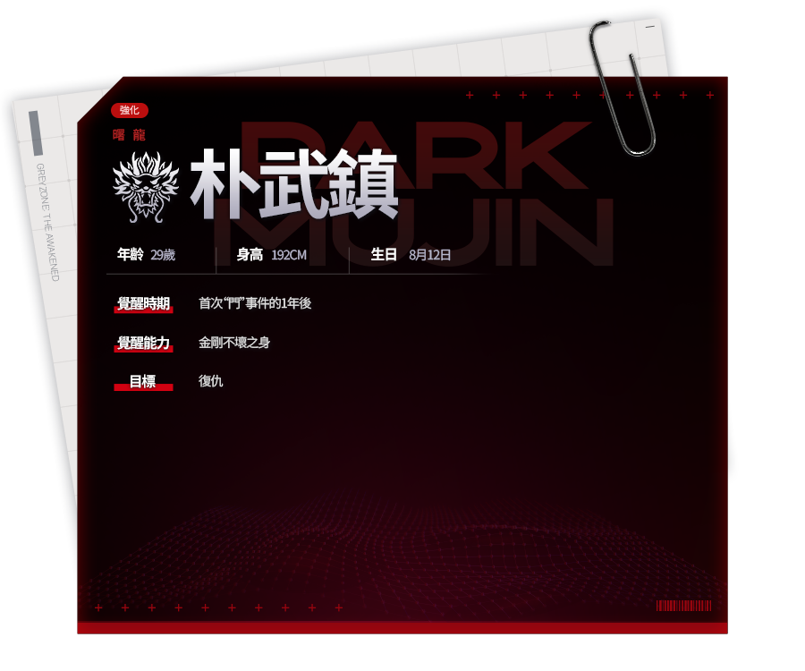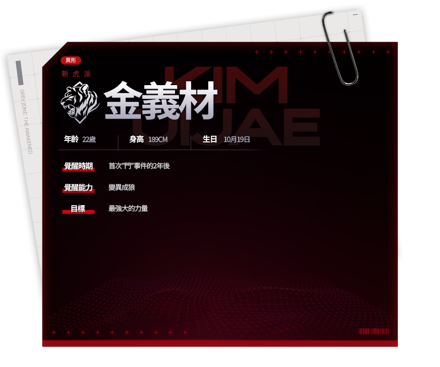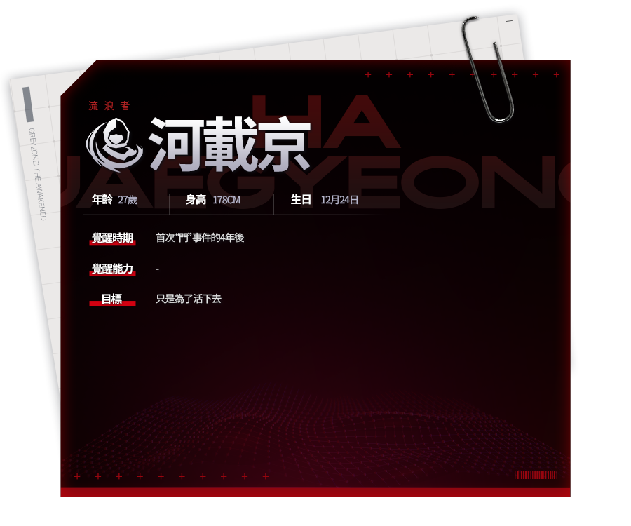 在隕石事件中失去深愛自己的母親,與父親兩人在首爾相依為命,意外感染覺醒能力。覺醒時掙扎不已,卻因自身氣息傷害了父親,因無法獲得及時治療而不幸喪命。迷失於人生方向,在街頭徘徊時獲得了曙龍幫首領姜勇祖的恩惠,並學會了如何控制自己的能力