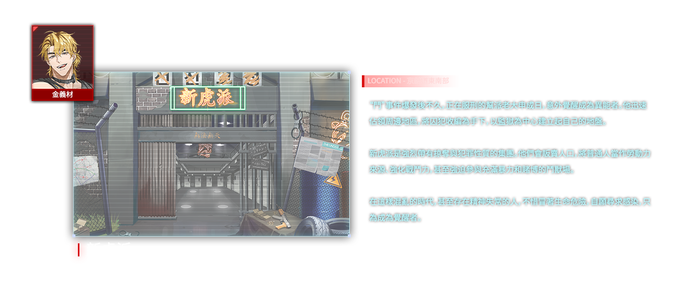 「最初覺醒的異能者」\n某生物科技企業代表與政治家夫妻的獨子。