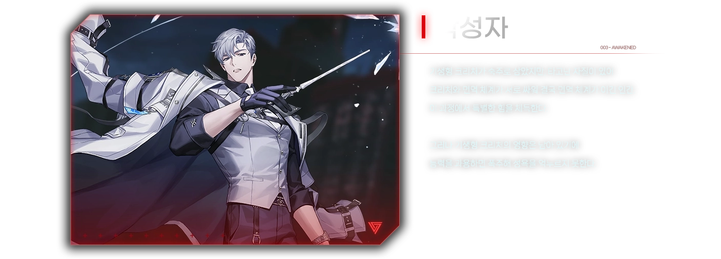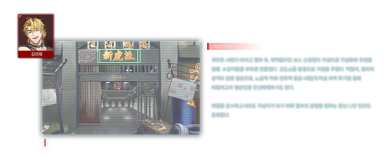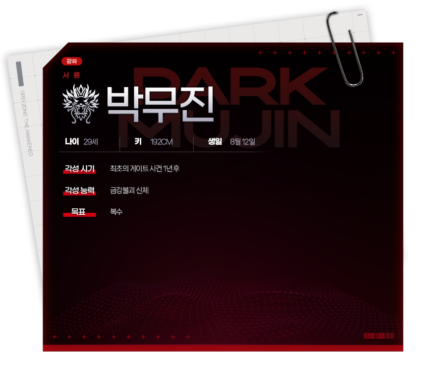 게이트 사태 이후 모종의 이유로 모시던 보스인 강영조에게 배신당하고 간신히 살아남았다. 복수가 목적이라 무엇이든 할 수 있다. 이능력은 신체 강화. 총에 맞아도 다치지 않는다. 다만 '추위를 느끼면' 능력이 저하되는 특이한 체질.