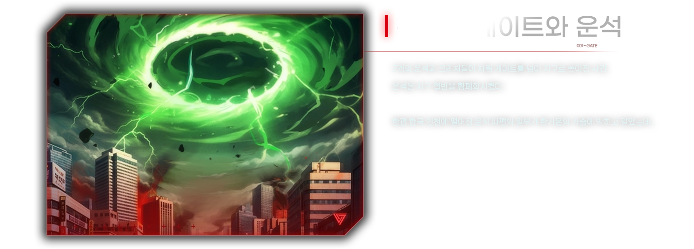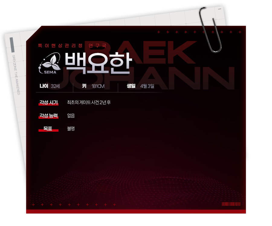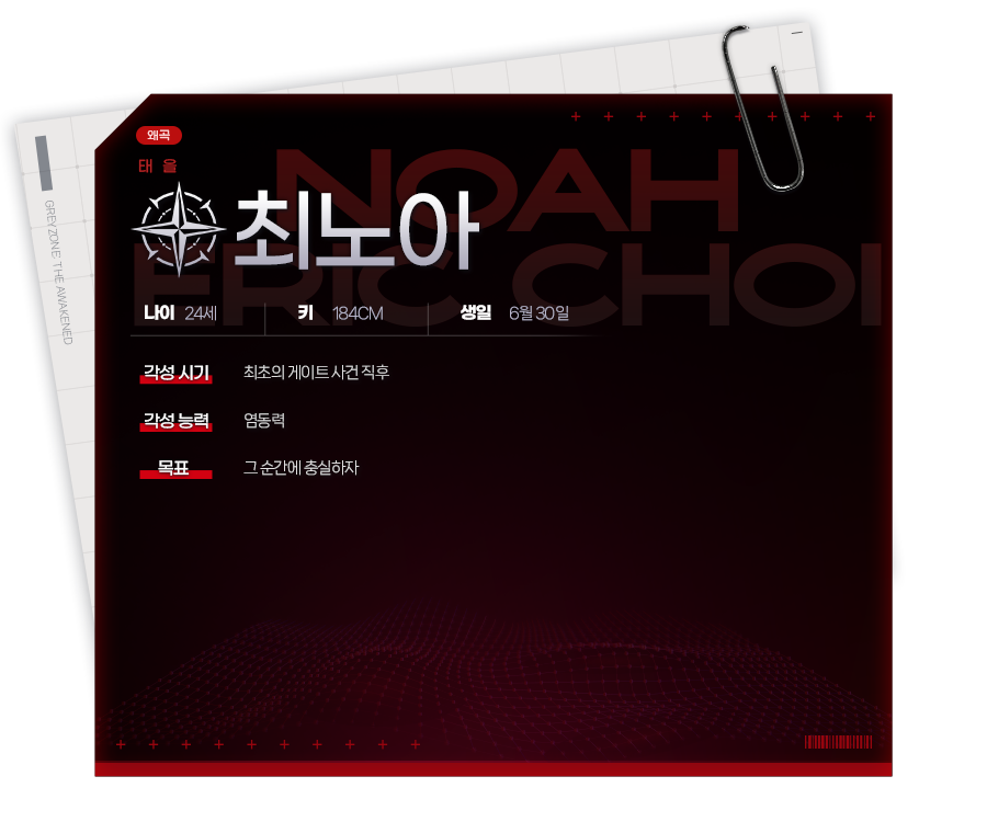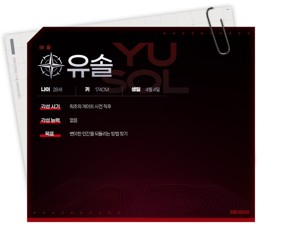 휴식기 중 어머니와 함께 한국으로 휴가를 왔는데, 게이트 현상에 휘말리면서 부모를 잃고 지금의 파트너 유솔과 인연이 생겼다. 미국으로 돌아가려 했으나 상황이 해결되지 않아 기다리던 몇 달간 솔과 관계가 깊어졌고, 솔은 당장 한국을 떠날 수 없는 까닭이 있었기에 결국 위험을 감수하고 함께 목표를 이루기 위해 노력하게 되었다.