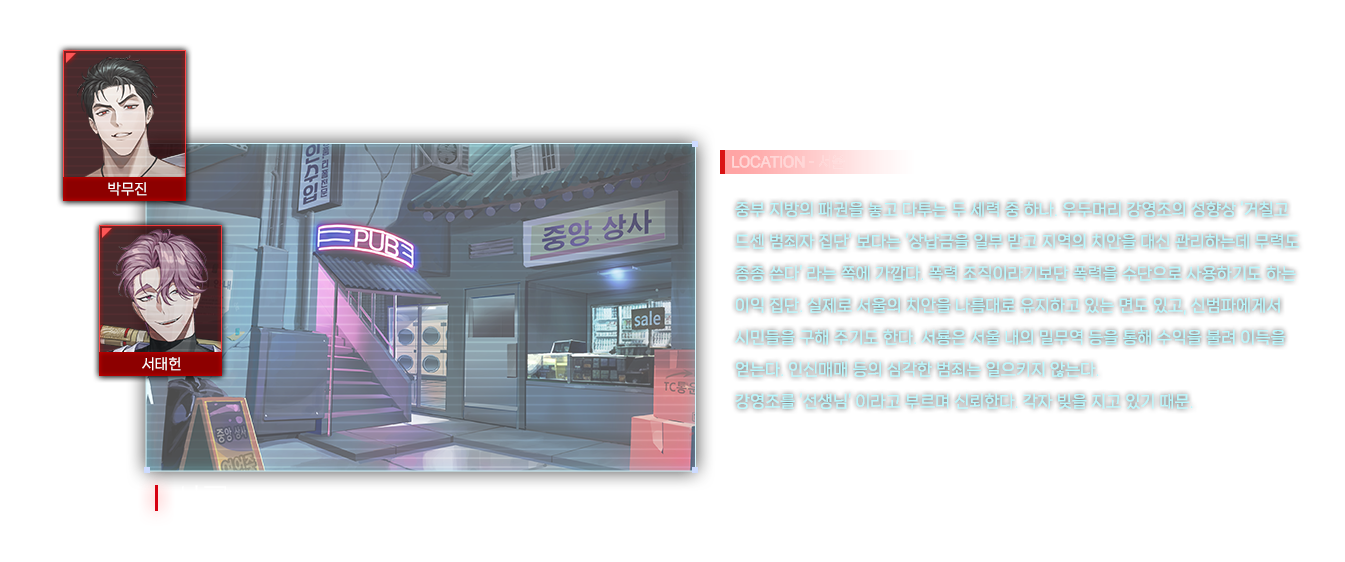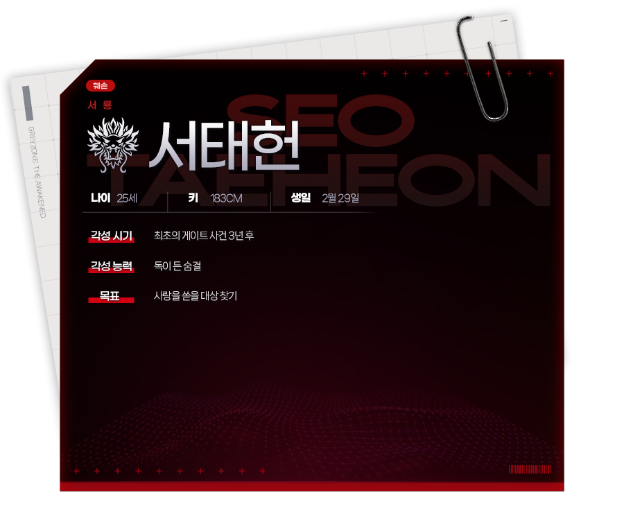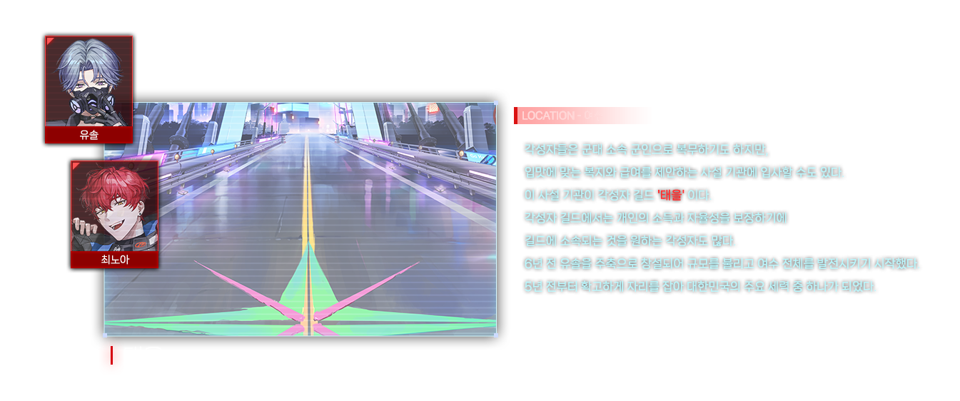 여수를 중심으로 활동하는 길드 '태을' 의 길드장이자 가이드. 자유롭게 활동하길 원하는 각성자들을 모아 목표에 협조해 주길 부탁했고, 용병단처럼 시작된 모임이 길드가 되어 여수에 자리잡았다.