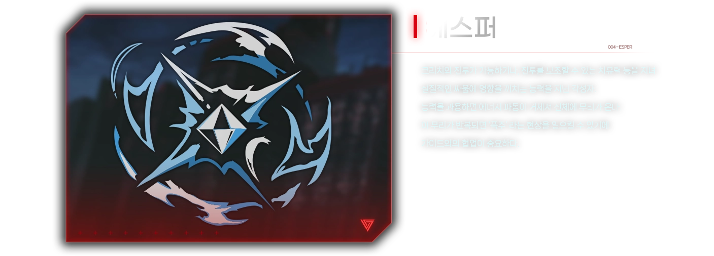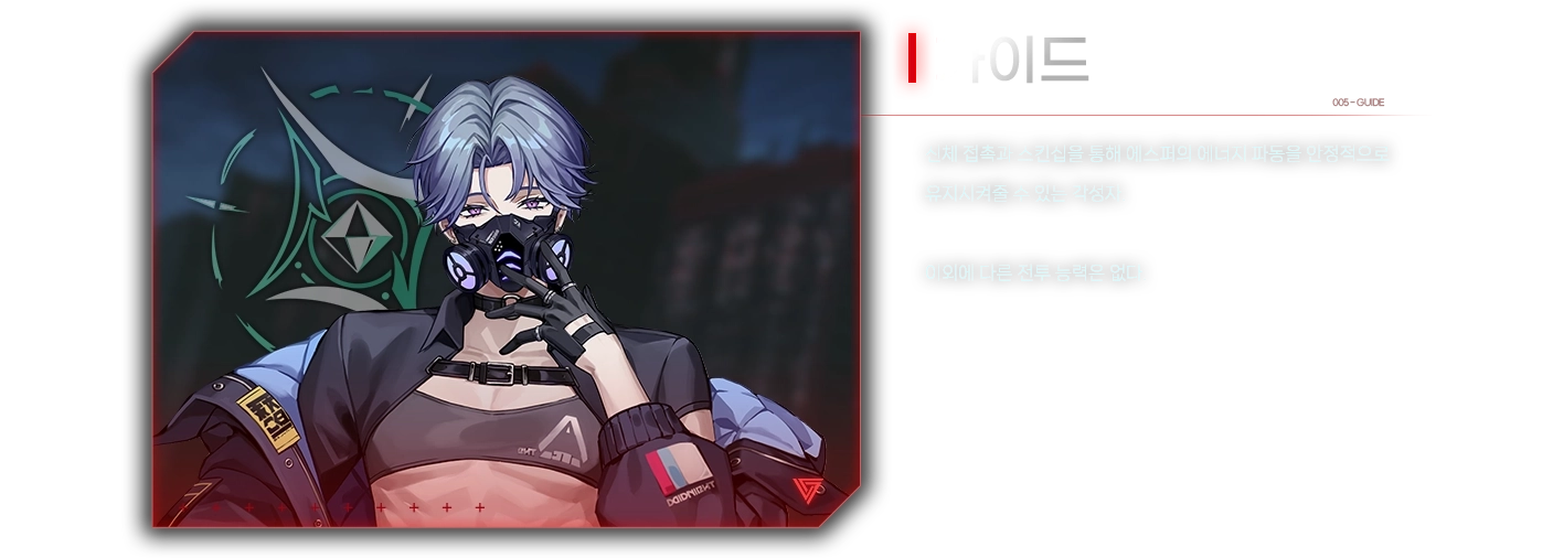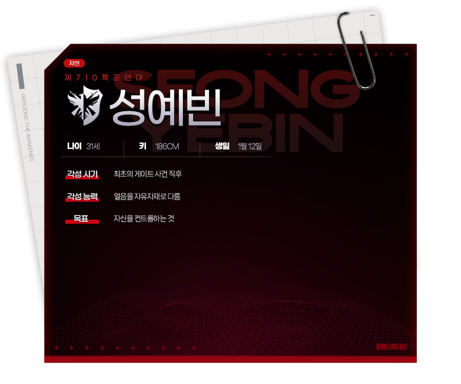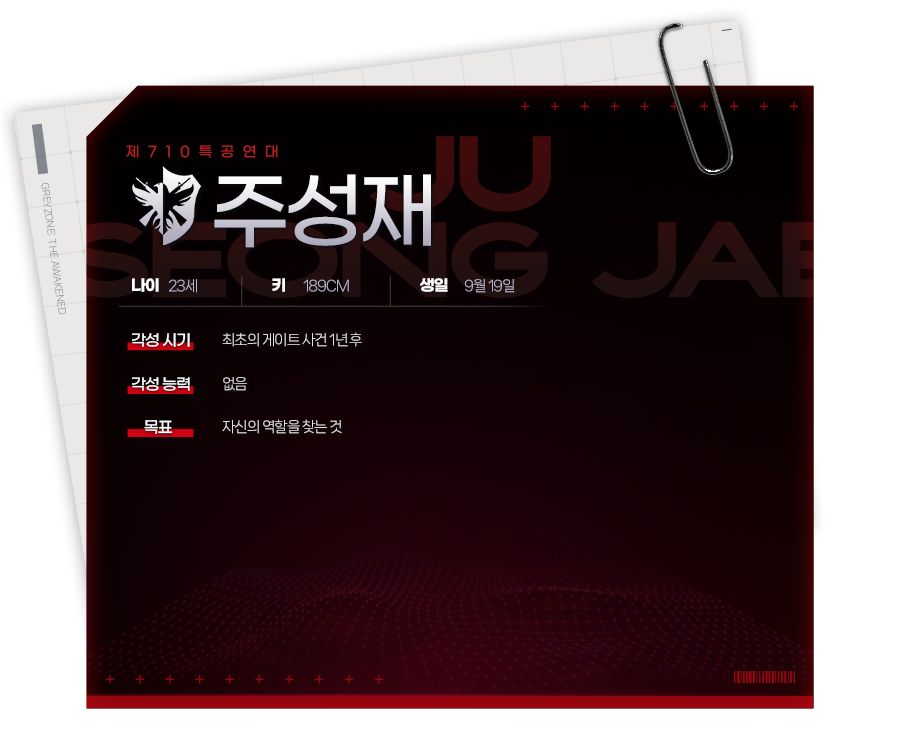 연구국 소속으로서 호위를 담당하는 부사관 에스퍼. 평범한 대학생이었는데, 7년 전 게이트 사태가 터지면서 부모를 잃었다. 고향 어른에게 전달 받은 부모님의 물건을 정리하던 중, 아버지의 카메라에 손을 댄 순간 사이코메트리 능력을 각성했다.