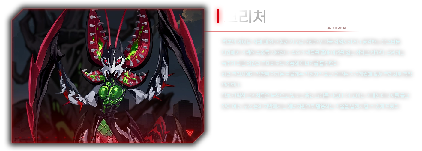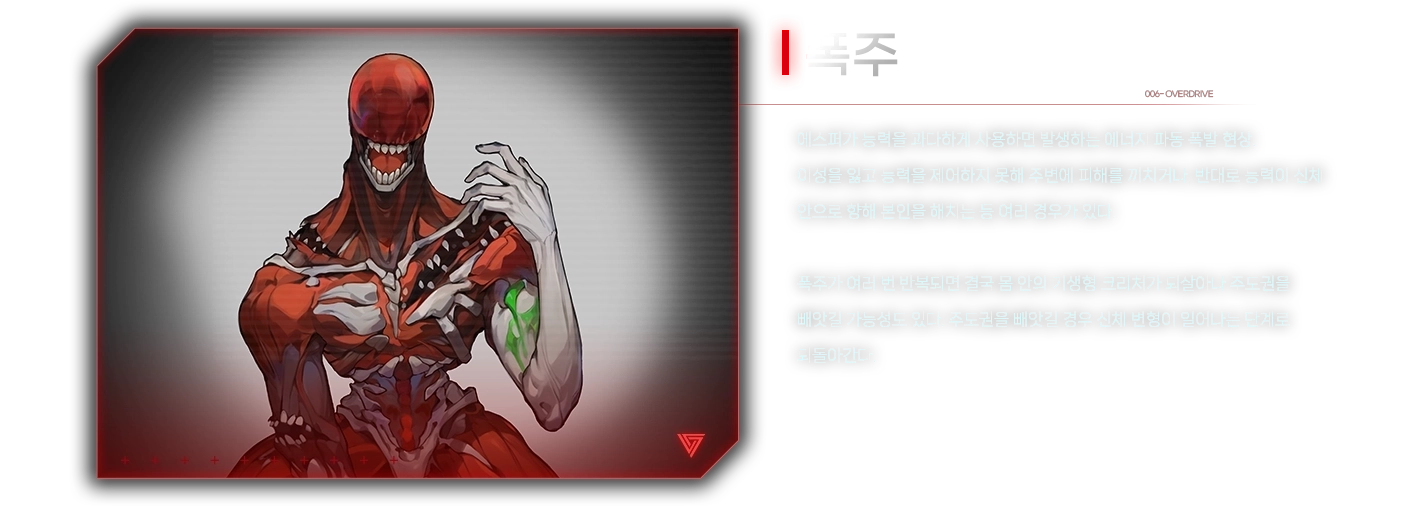 내리사랑을 쏟아 주던 어머니를 운석 사태로 여의고 아버지와 단둘이 서울에서 살아가다 우연하게 감염되어 각성했다. 각성 과정에서 몸부림치던 중 제 숨으로 아버지를 해쳤고, 적절한 치료를 받기 어려웠던 아버지는 목숨을 잃었다. 어떻게 살아야 할지 몰라 거리를 헤매다 서룡 보스 강영조에게 은혜를 입고 능력을 제어하는 법을 배웠다.
