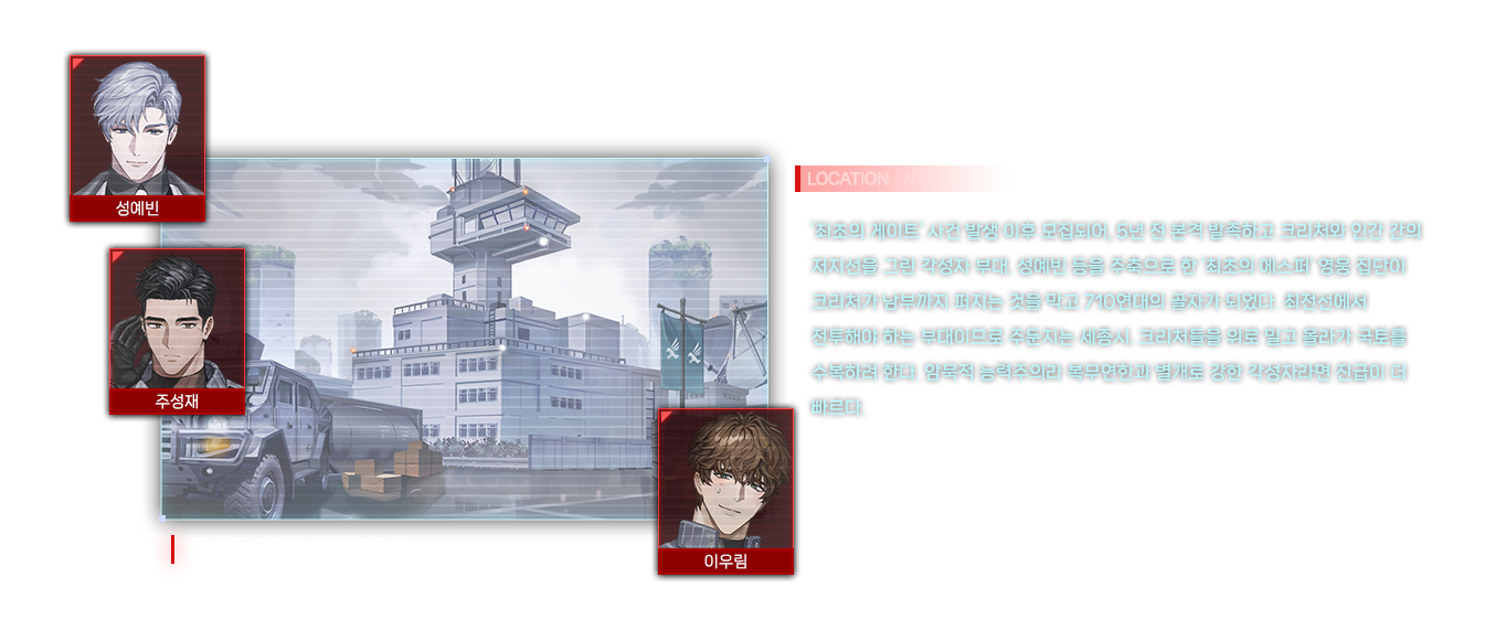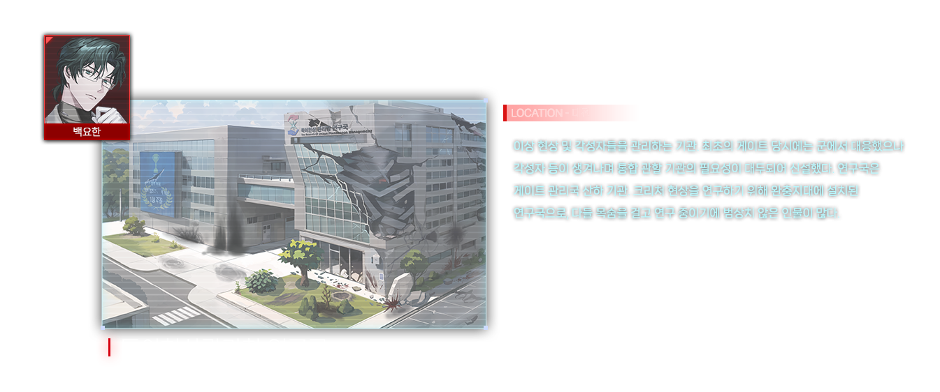 관리청 연구국 소속 연구원이자 가이드. 각성자들의 신체 검사부터 '포션' 등의 신체 강화제, 던전에서 나타난 아이템 등 다방면을 연구한다. 전공 자체는 생명공학으로 박사까지 취득했다. 모 기업에서 전문연구요원으로 병역 이행.
